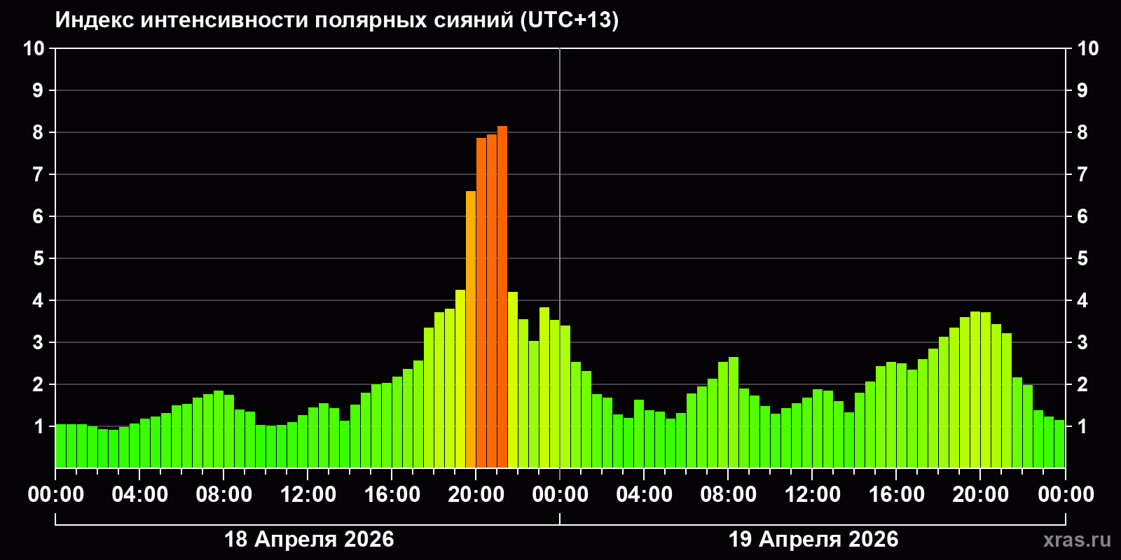 Изменения индекса интенсивности полярных сияний с 2026-04-18 по 2026-04-19 по местному времени