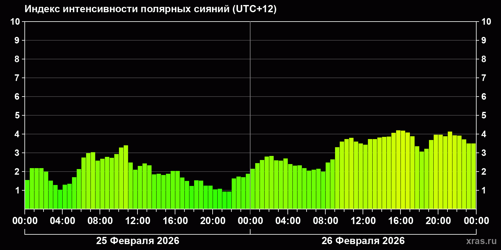 Изменения индекса интенсивности полярных сияний с 2026-02-25 по 2026-02-26 по местному времени