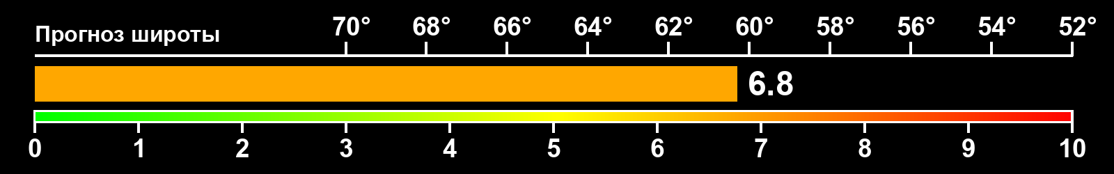 Индекс интенсивности полярных сияний и теоретически возможная широта наблюдений для ночного времени в восточном полушарии по состоянию на 2025-02-27 23:49 (конец дня) по местному времени