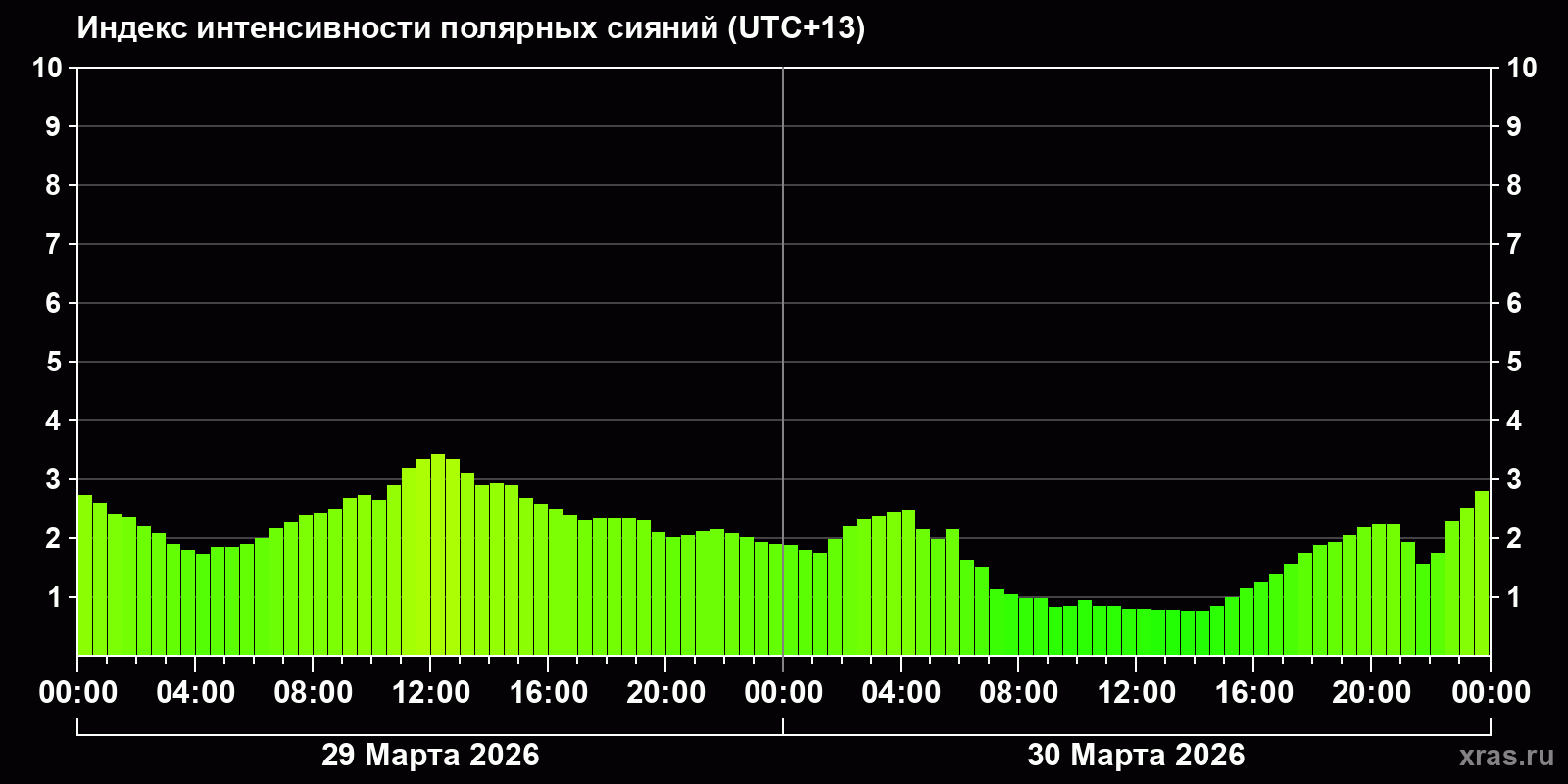 Изменения индекса интенсивности полярных сияний с 2026-03-29 по 2026-03-30 по местному времени