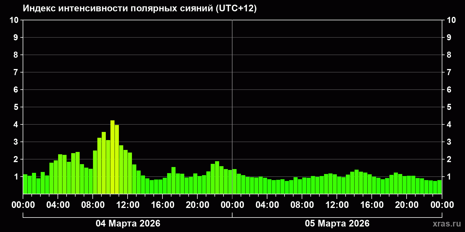 Изменения индекса интенсивности полярных сияний с 2026-03-04 по 2026-03-05 по местному времени