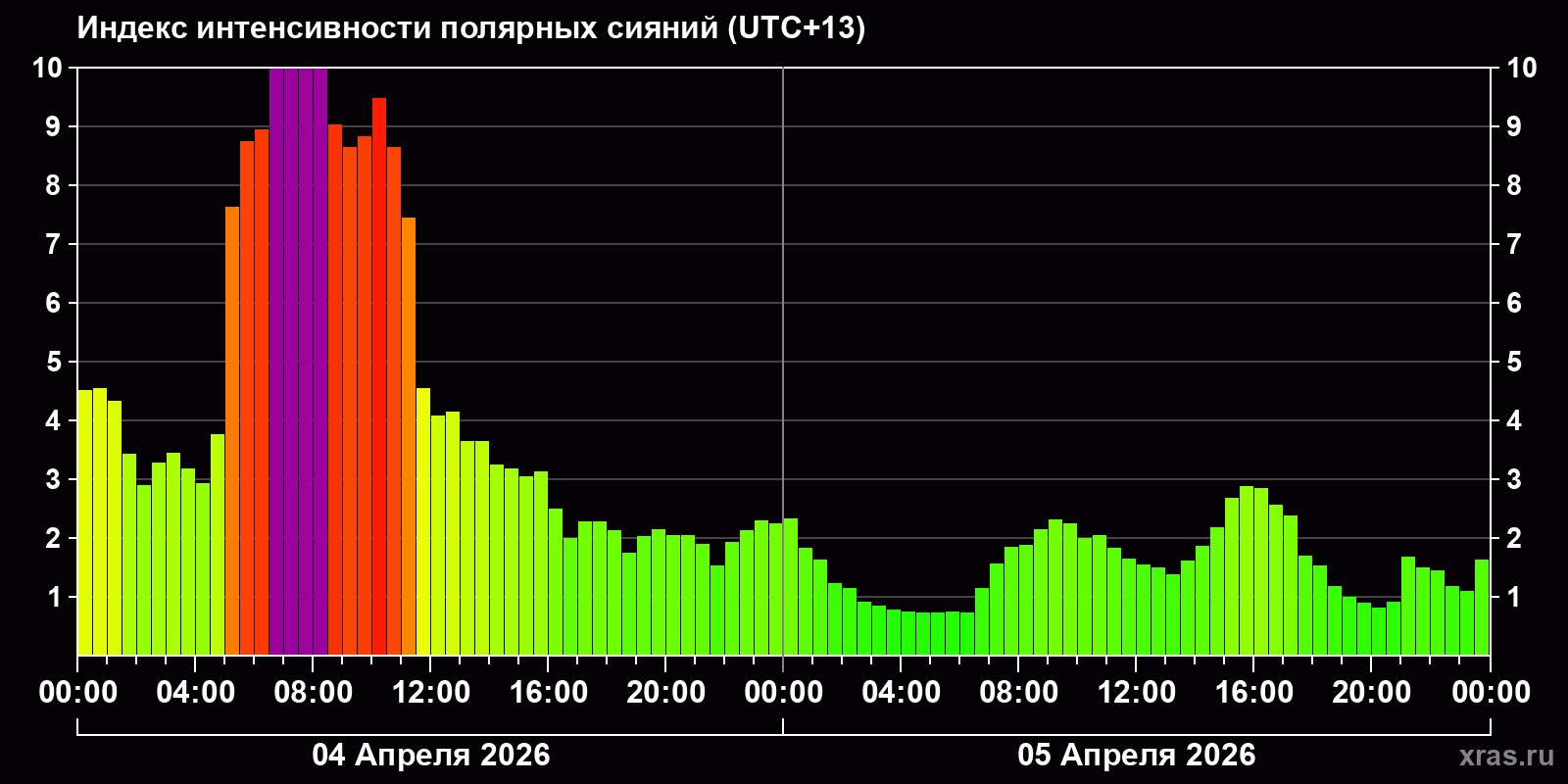 Изменения индекса интенсивности полярных сияний с 2026-04-04 по 2026-04-05 по местному времени