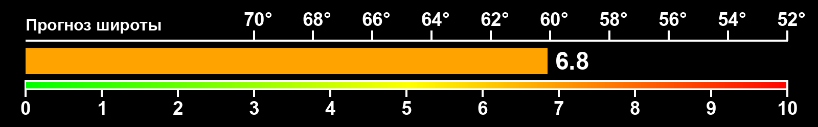 Индекс интенсивности полярных сияний и теоретически возможная широта наблюдений для ночного времени в восточном полушарии по состоянию на 2025-03-09 23:47 (конец дня) по местному времени