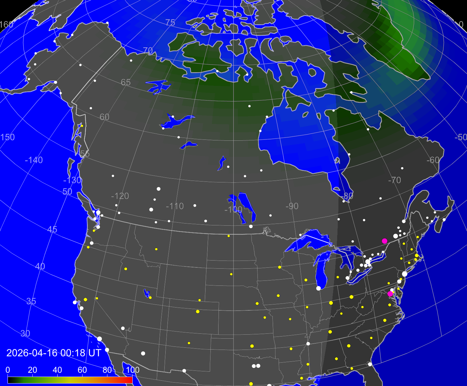 Вероятность полярных сияний в городах США