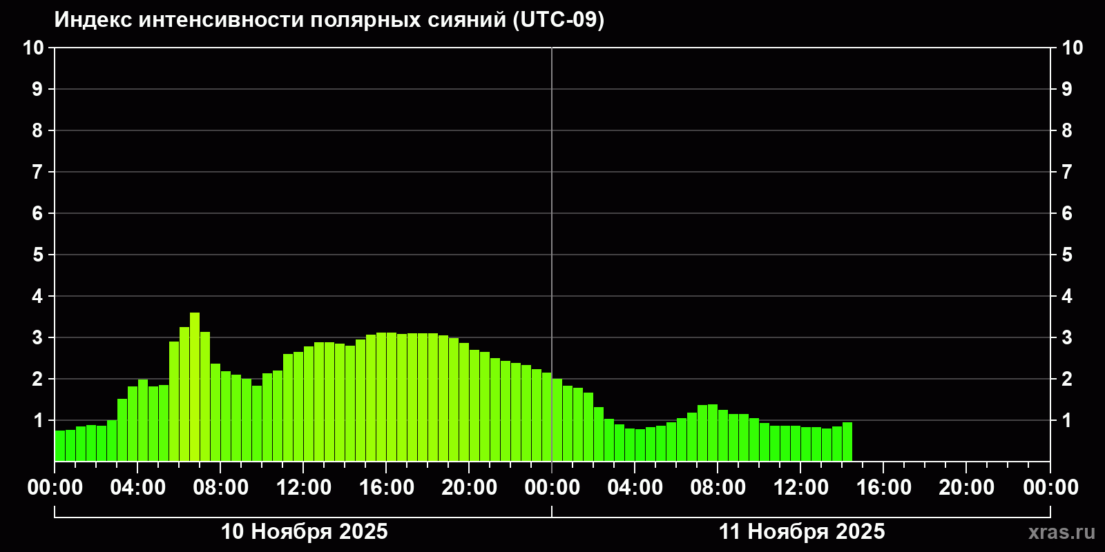 Изменения индекса интенсивности полярных сияний с 2025-11-10 по 2025-11-11 по местному времени