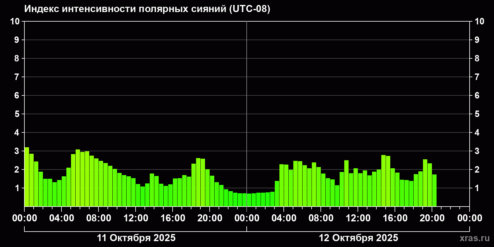 Изменения индекса интенсивности полярных сияний с 2025-10-11 по 2025-10-12 по местному времени