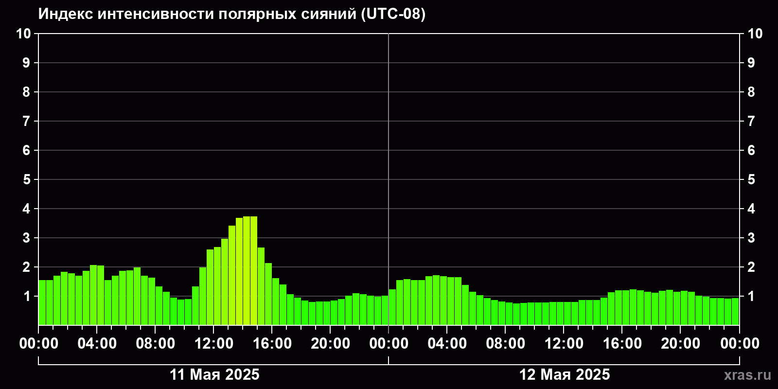 Изменения индекса интенсивности полярных сияний с 2025-05-11 по 2025-05-12 по местному времени