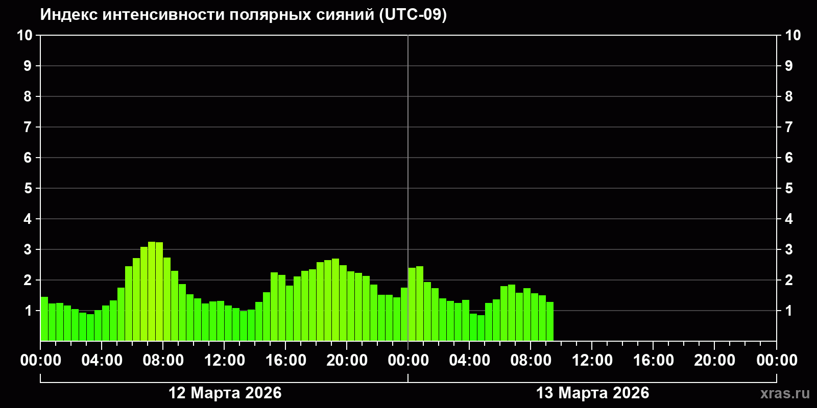 Изменения индекса интенсивности полярных сияний с 2026-03-12 по 2026-03-13 по местному времени