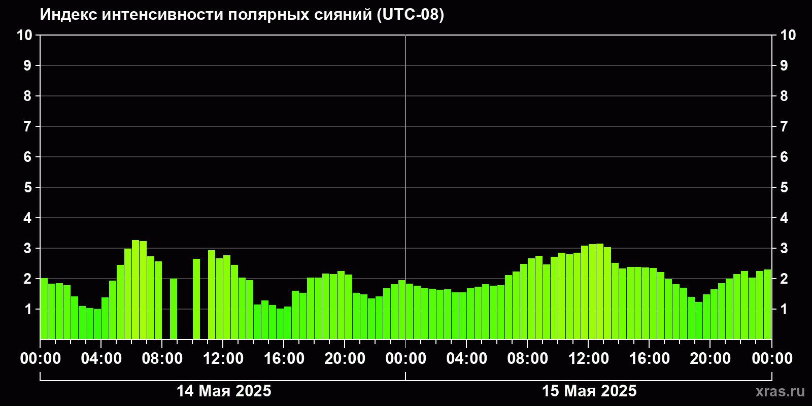 Изменения индекса интенсивности полярных сияний с 2025-05-14 по 2025-05-15 по местному времени