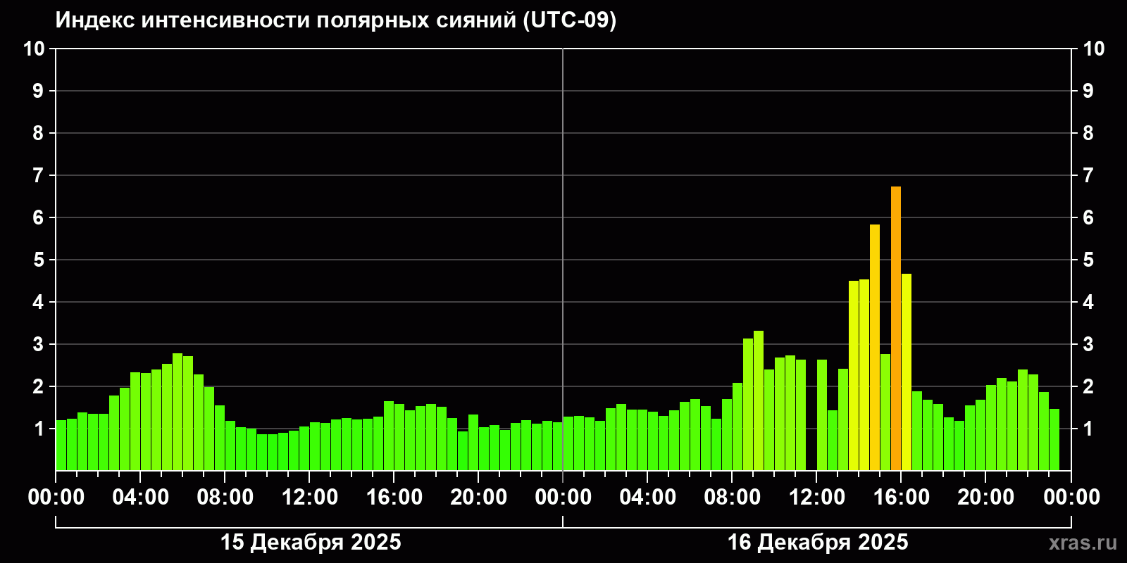 Изменения индекса интенсивности полярных сияний с 2025-12-15 по 2025-12-16 по местному времени