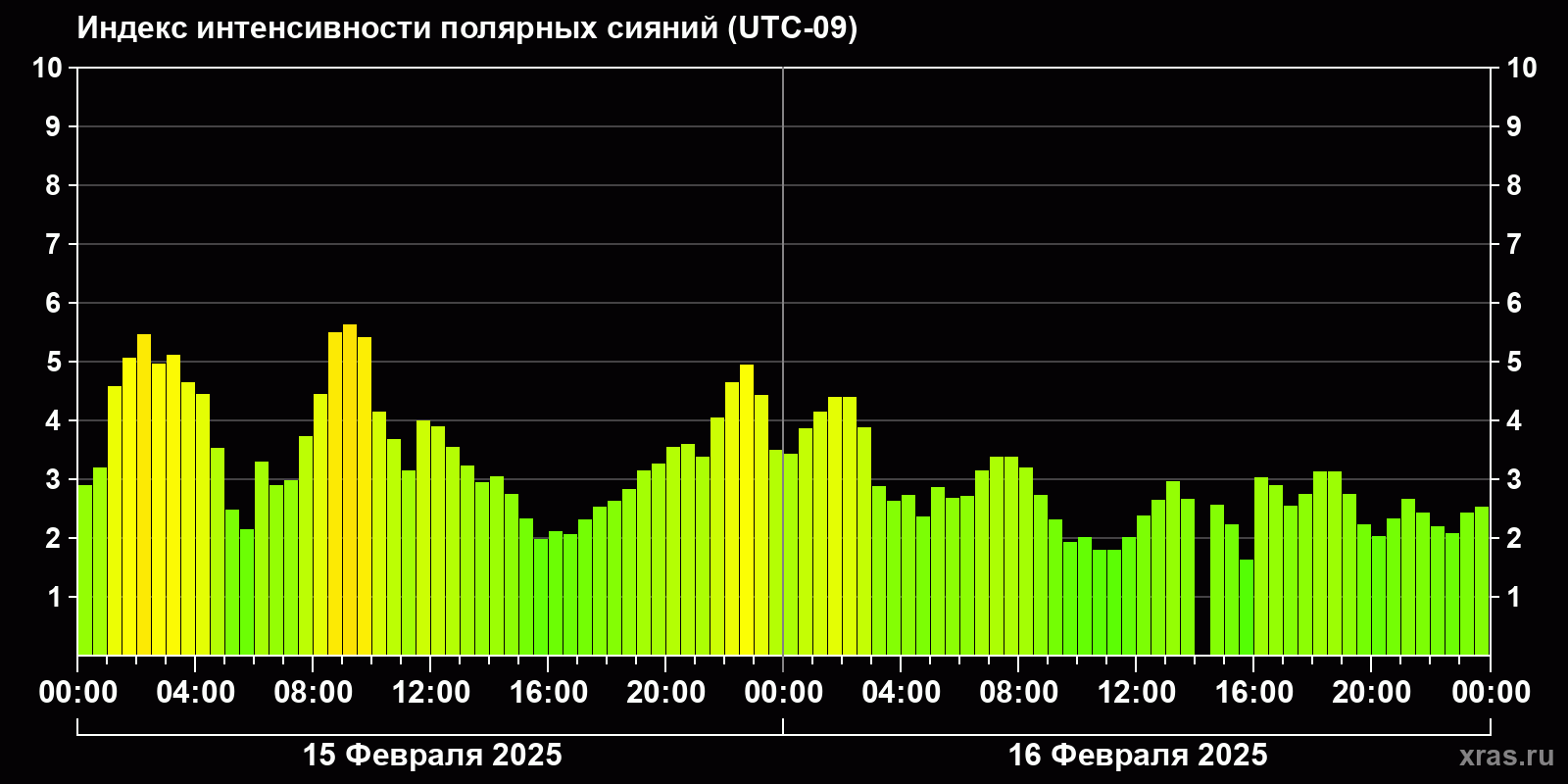 Изменения индекса интенсивности полярных сияний с 2025-02-15 по 2025-02-16 по местному времени