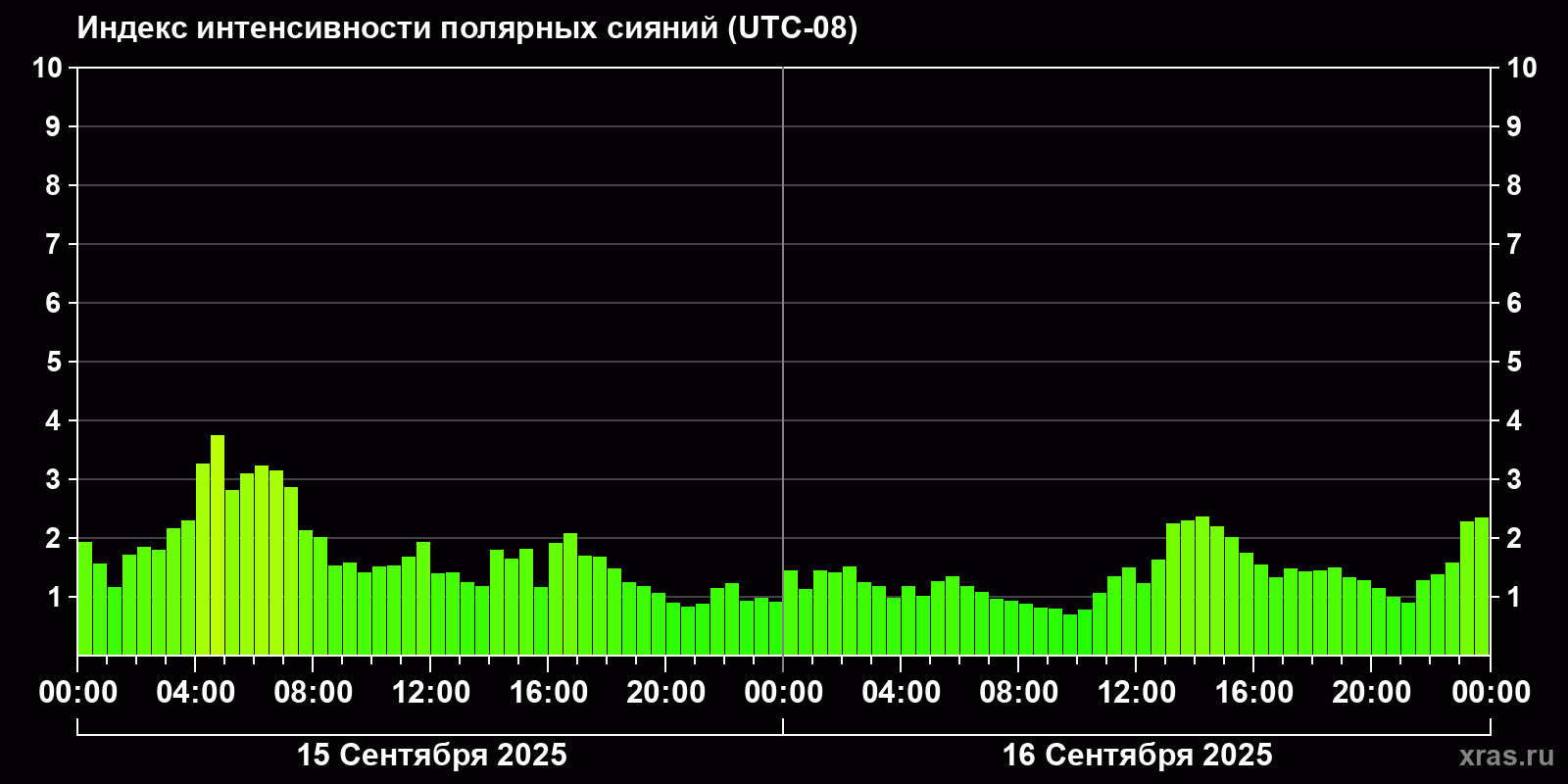 Изменения индекса интенсивности полярных сияний с 2025-09-15 по 2025-09-16 по местному времени