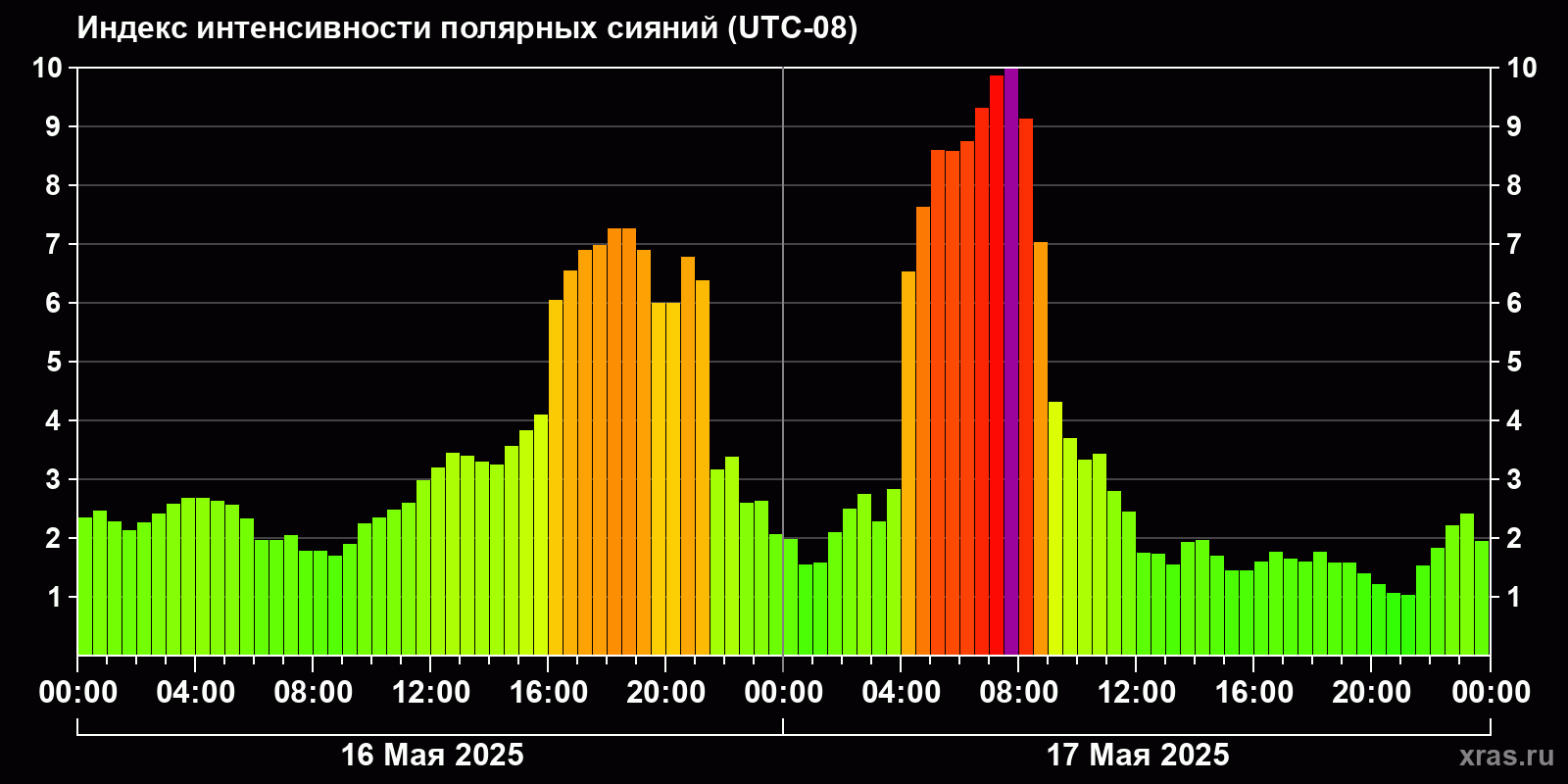Изменения индекса интенсивности полярных сияний с 2025-05-16 по 2025-05-17 по местному времени