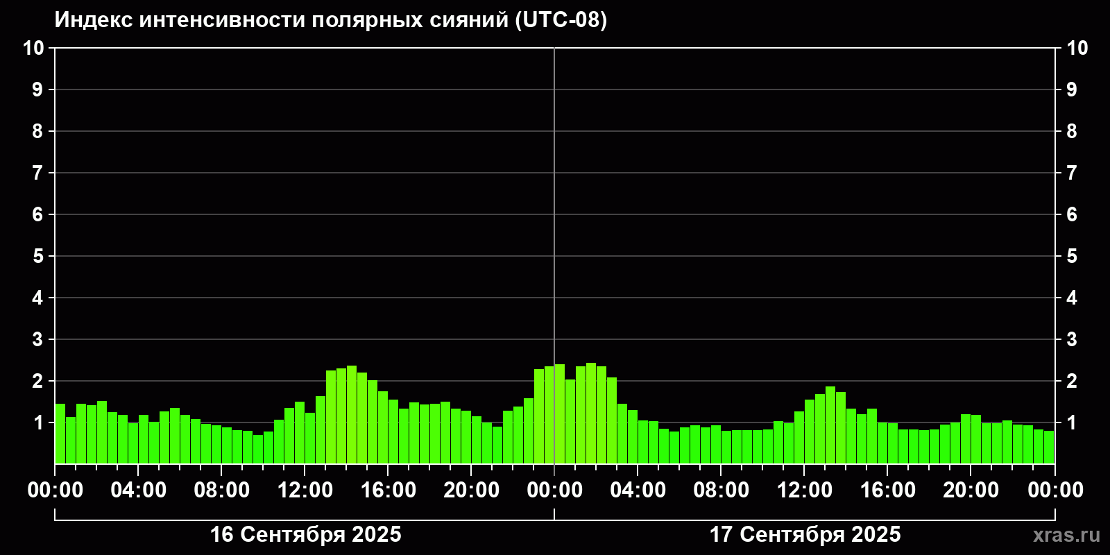 Изменения индекса интенсивности полярных сияний с 2025-09-16 по 2025-09-17 по местному времени