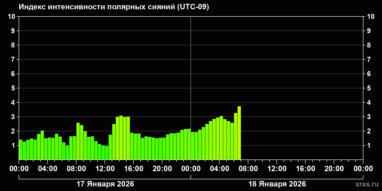 Изменения индекса интенсивности полярных сияний с 2026-01-17 по 2026-01-18 по местному времени
