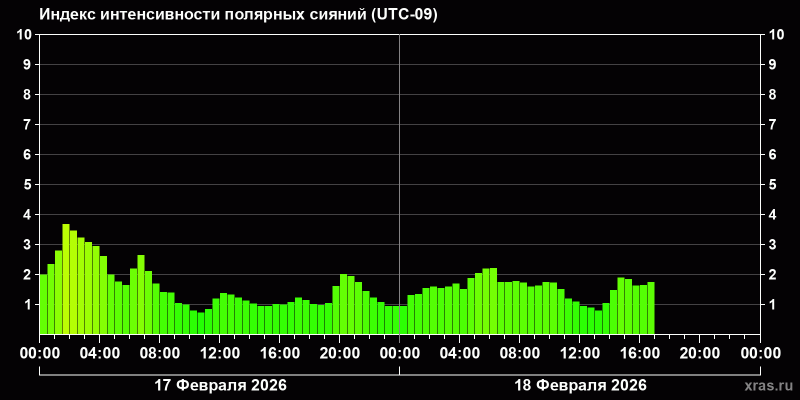 Изменения индекса интенсивности полярных сияний с 2026-02-17 по 2026-02-18 по местному времени