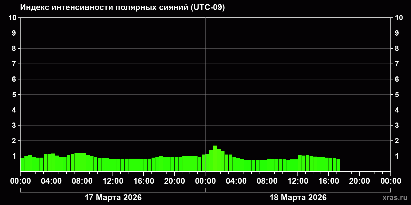 Изменения индекса интенсивности полярных сияний с 2026-03-17 по 2026-03-18 по местному времени