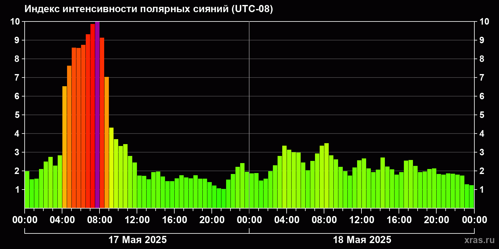 Изменения индекса интенсивности полярных сияний с 2025-05-17 по 2025-05-18 по местному времени