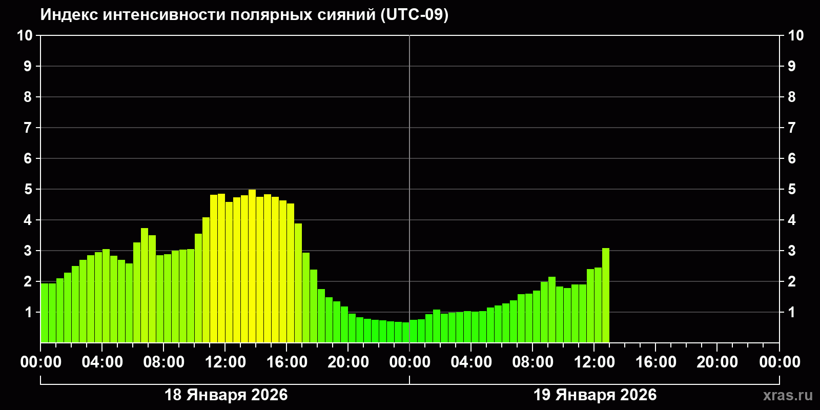 Изменения индекса интенсивности полярных сияний с 2026-01-18 по 2026-01-19 по местному времени