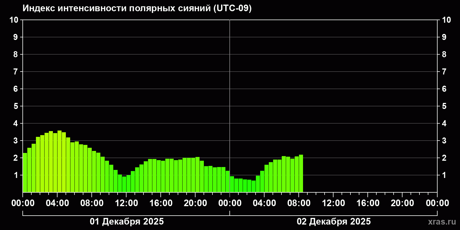Изменения индекса интенсивности полярных сияний с 2025-12-01 по 2025-12-02 по местному времени