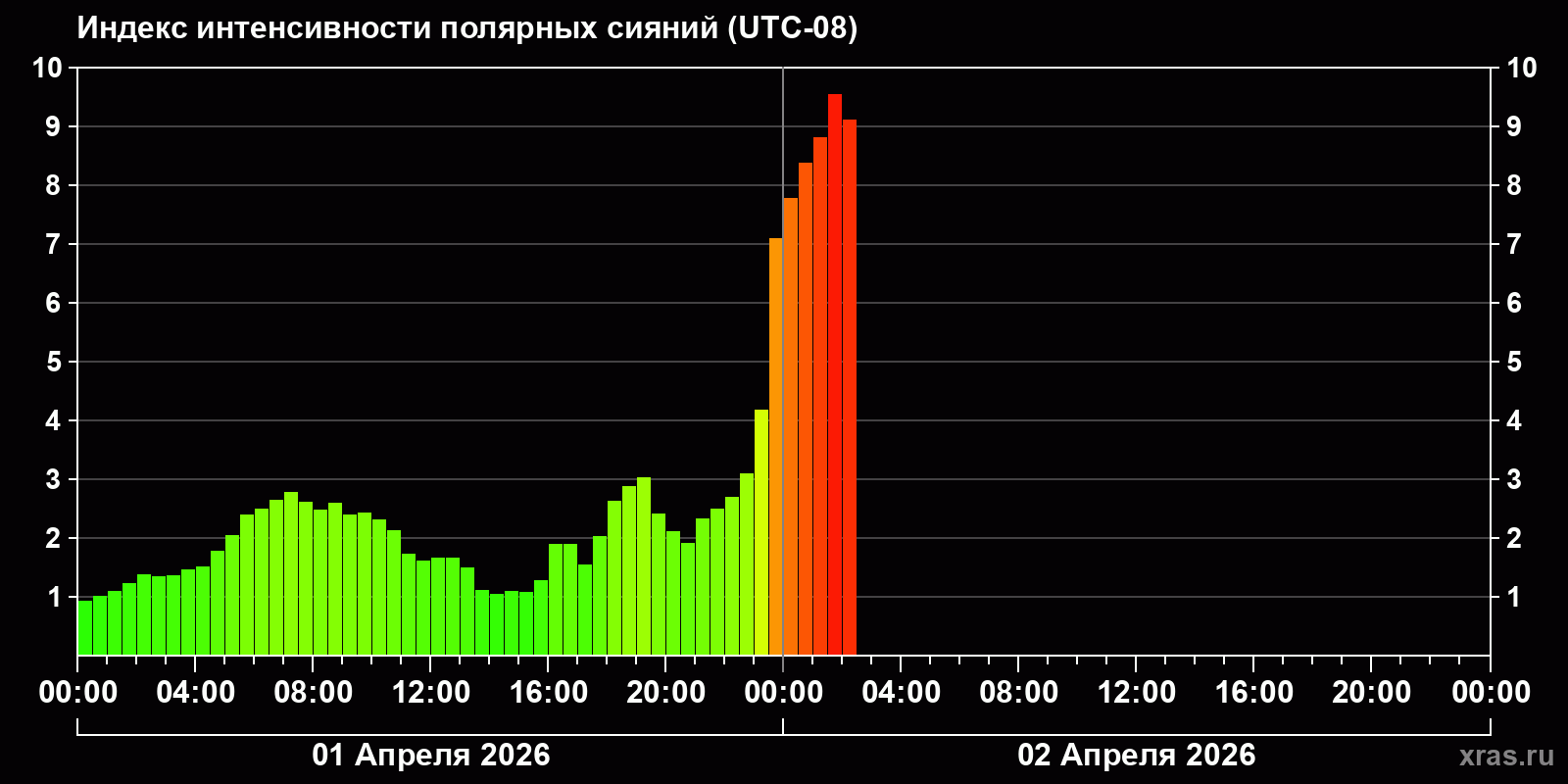 Изменения индекса интенсивности полярных сияний с 2026-04-01 по 2026-04-02 по местному времени