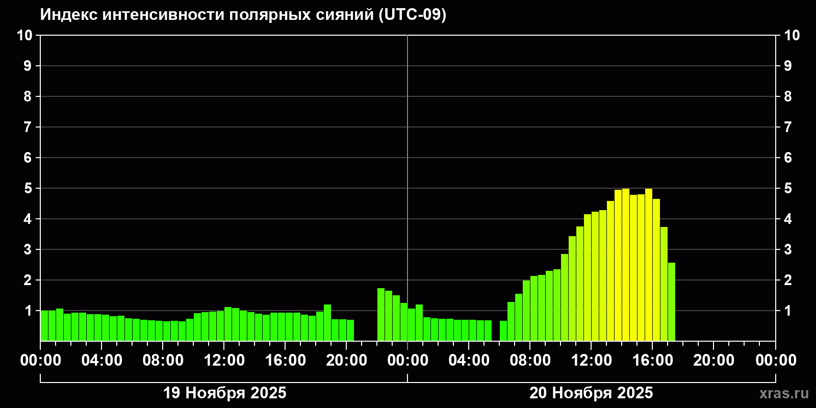 Изменения индекса интенсивности полярных сияний с 2025-11-19 по 2025-11-20 по местному времени