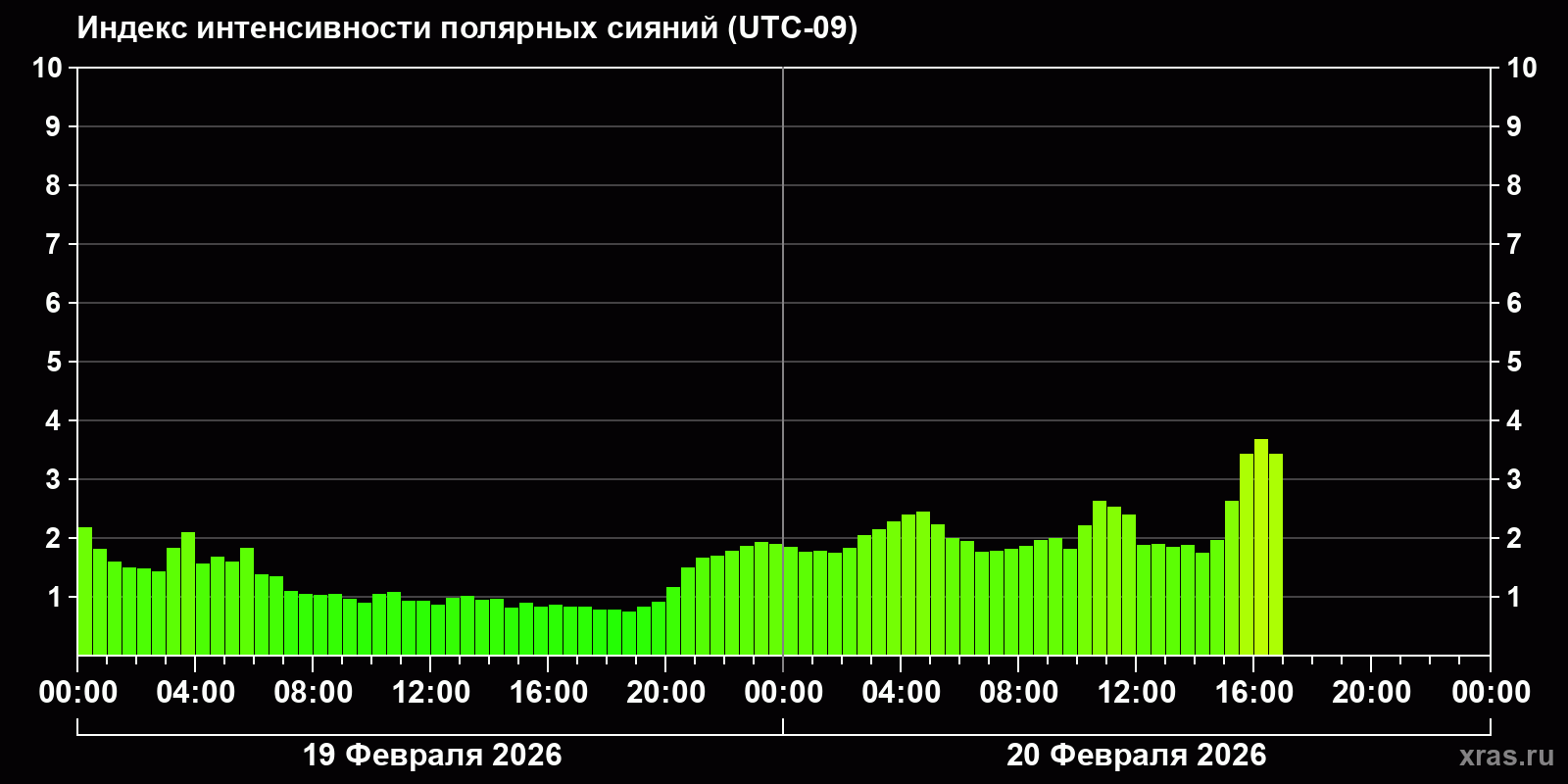 Изменения индекса интенсивности полярных сияний с 2026-02-19 по 2026-02-20 по местному времени