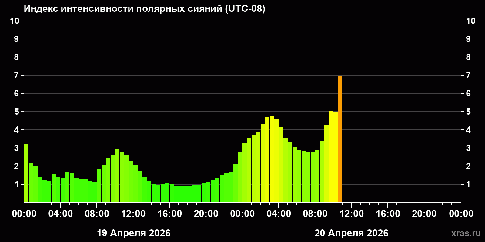 Изменения индекса интенсивности полярных сияний с 2026-04-19 по 2026-04-20 по местному времени