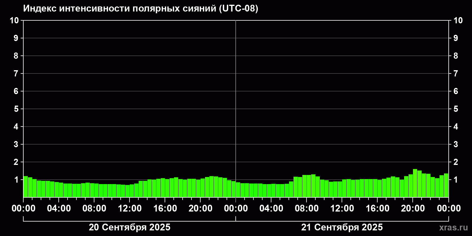 Изменения индекса интенсивности полярных сияний с 2025-09-20 по 2025-09-21 по местному времени