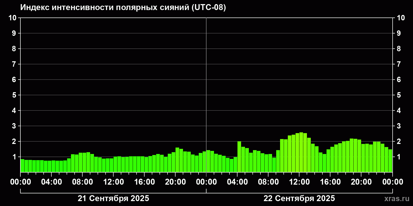 Изменения индекса интенсивности полярных сияний с 2025-09-21 по 2025-09-22 по местному времени