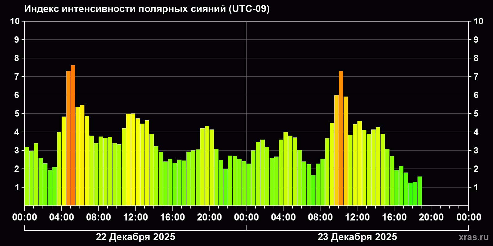 Изменения индекса интенсивности полярных сияний с 2025-12-22 по 2025-12-23 по местному времени