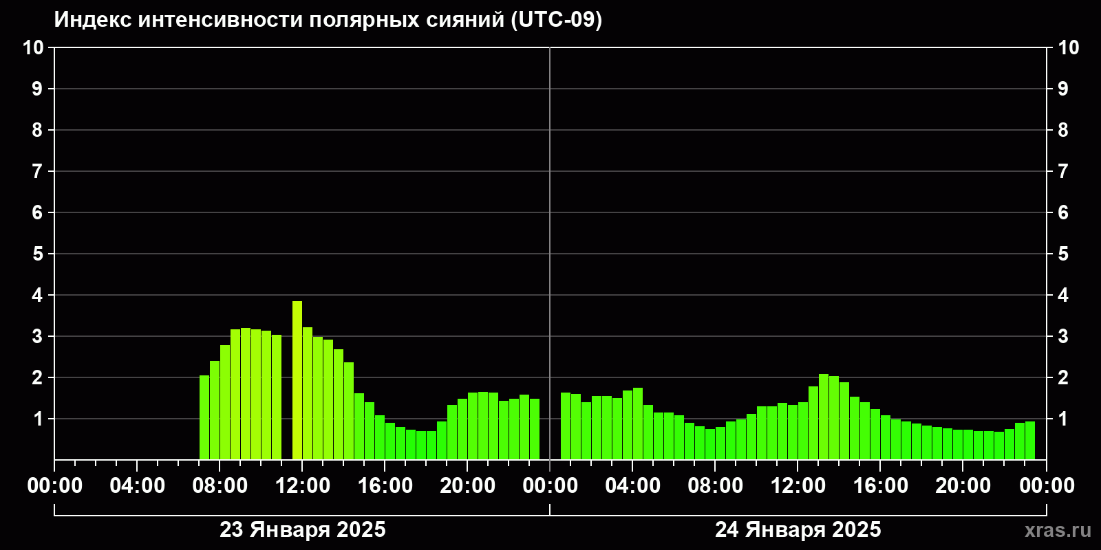 Изменения индекса интенсивности полярных сияний с 2025-01-23 по 2025-01-24 по местному времени