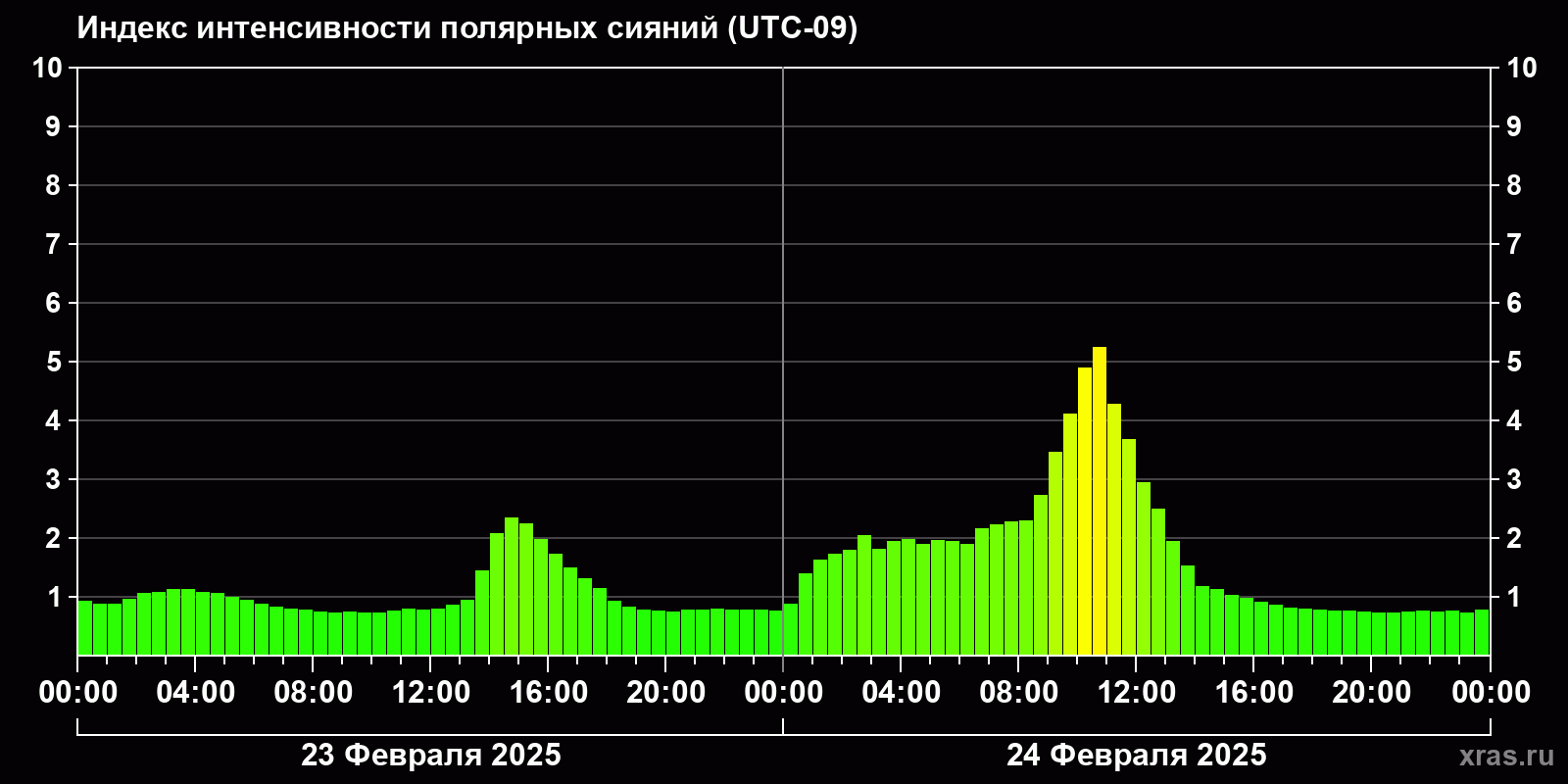 Изменения индекса интенсивности полярных сияний с 2025-02-23 по 2025-02-24 по местному времени