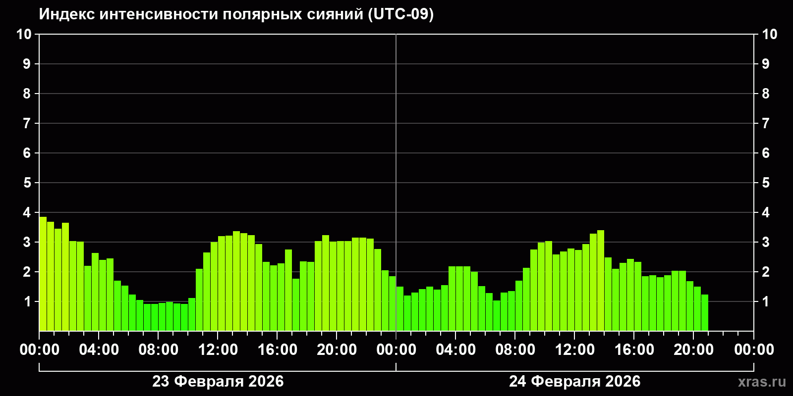 Изменения индекса интенсивности полярных сияний с 2026-02-23 по 2026-02-24 по местному времени