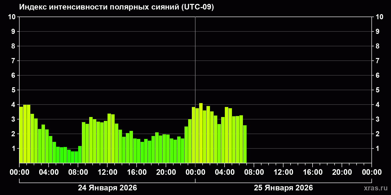 Изменения индекса интенсивности полярных сияний с 2026-01-24 по 2026-01-25 по местному времени