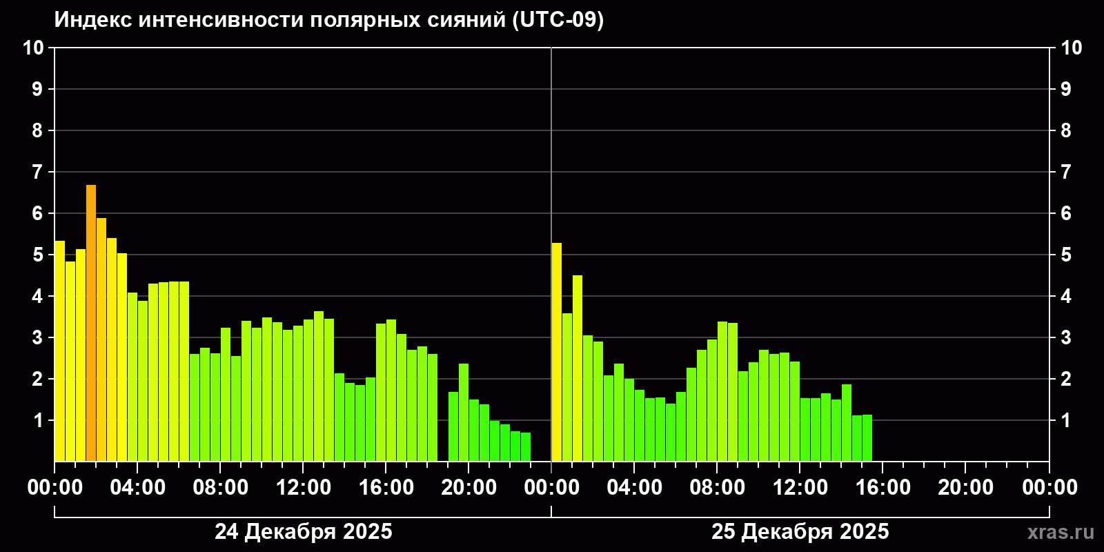 Изменения индекса интенсивности полярных сияний с 2025-12-24 по 2025-12-25 по местному времени