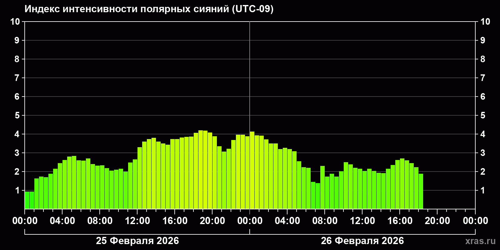 Изменения индекса интенсивности полярных сияний с 2026-02-25 по 2026-02-26 по местному времени