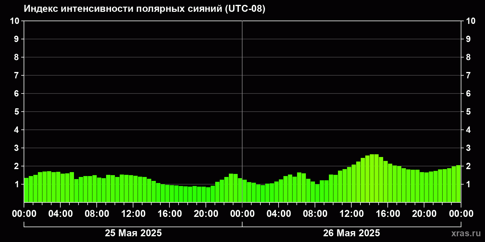 Изменения индекса интенсивности полярных сияний с 2025-05-25 по 2025-05-26 по местному времени