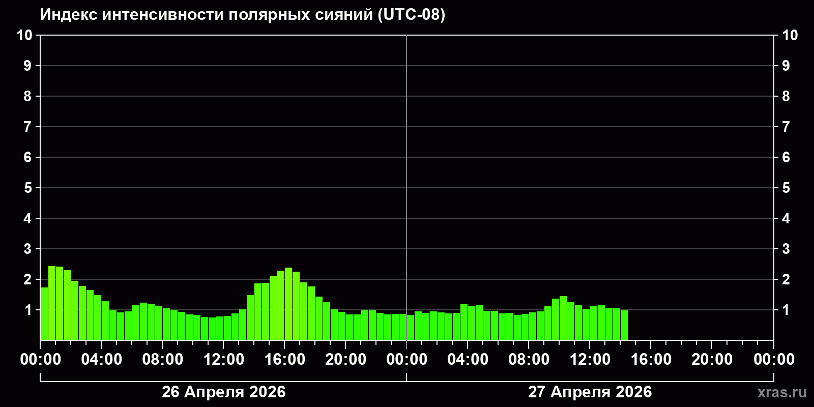 Изменения индекса интенсивности полярных сияний с 2026-04-26 по 2026-04-27 по местному времени