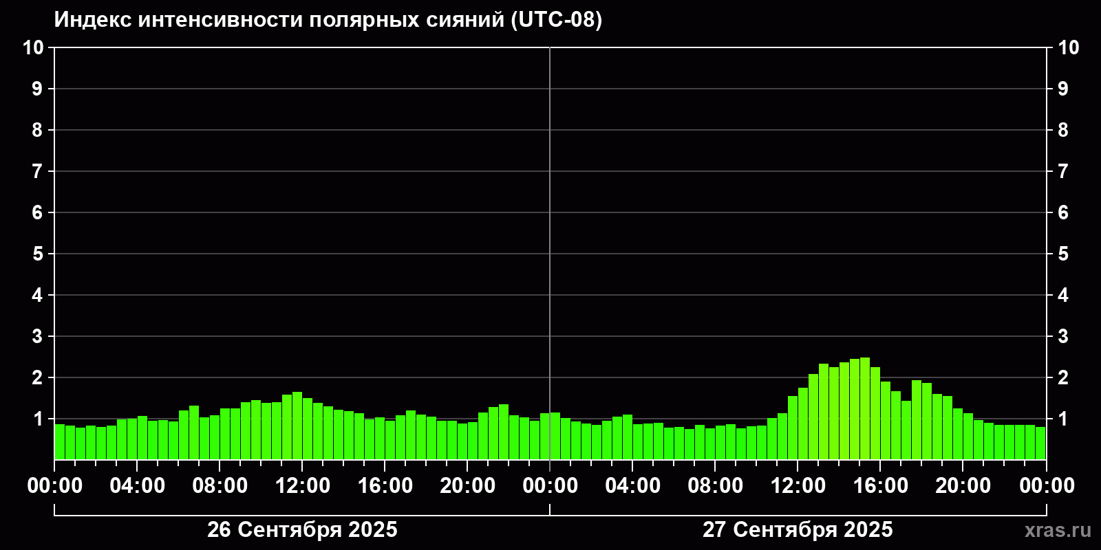 Изменения индекса интенсивности полярных сияний с 2025-09-26 по 2025-09-27 по местному времени