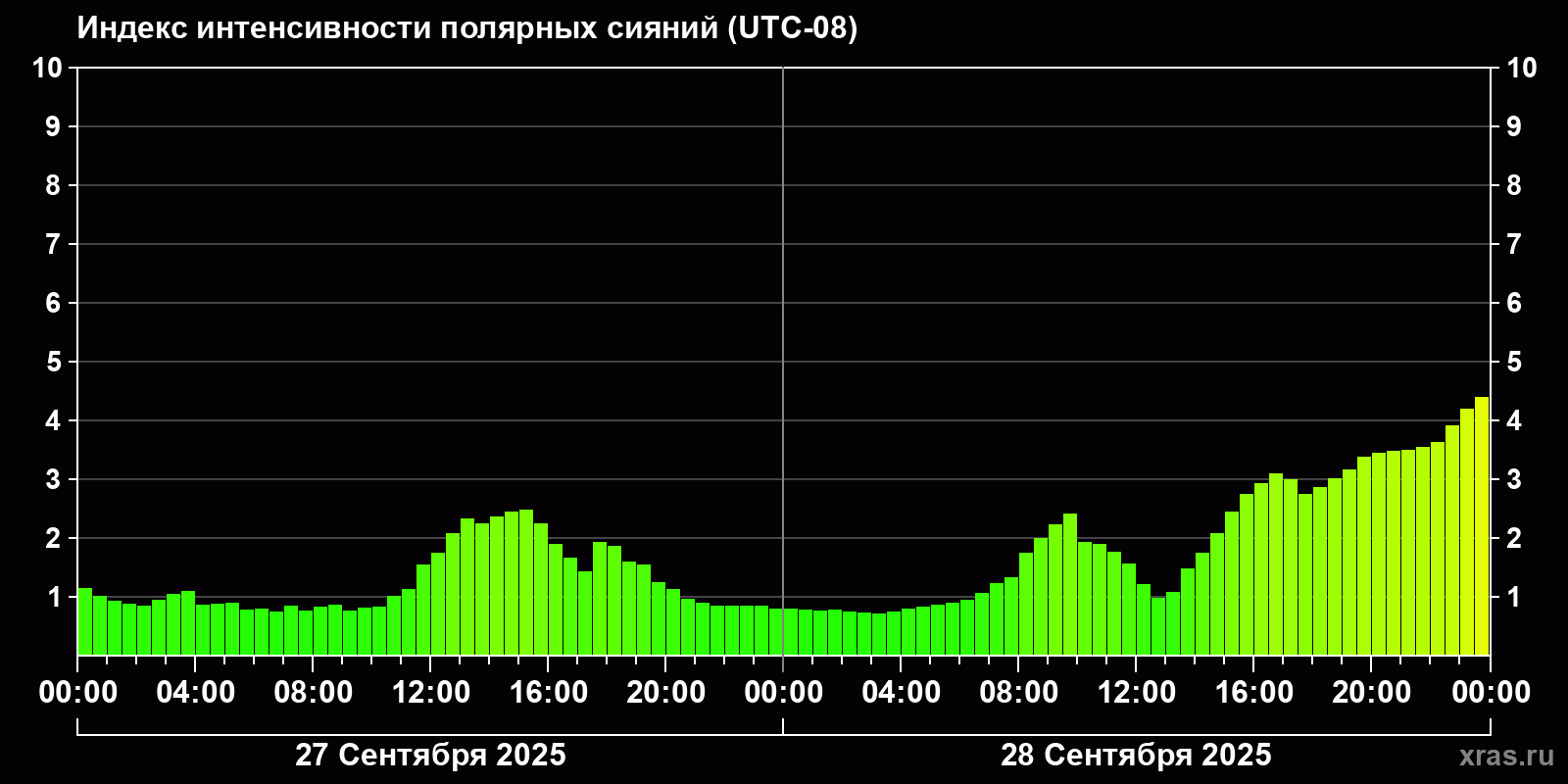 Изменения индекса интенсивности полярных сияний с 2025-09-27 по 2025-09-28 по местному времени