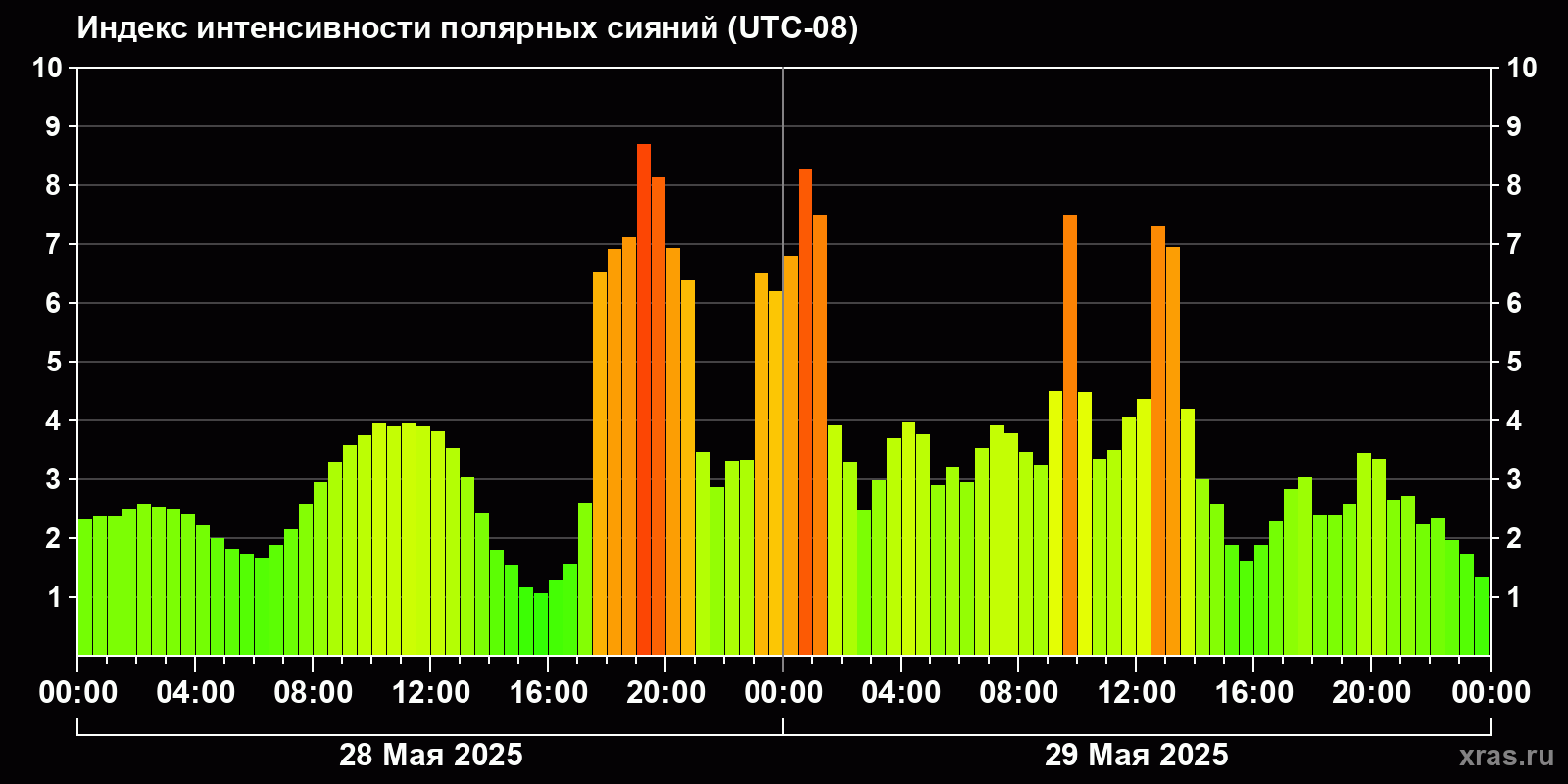 Изменения индекса интенсивности полярных сияний с 2025-05-28 по 2025-05-29 по местному времени