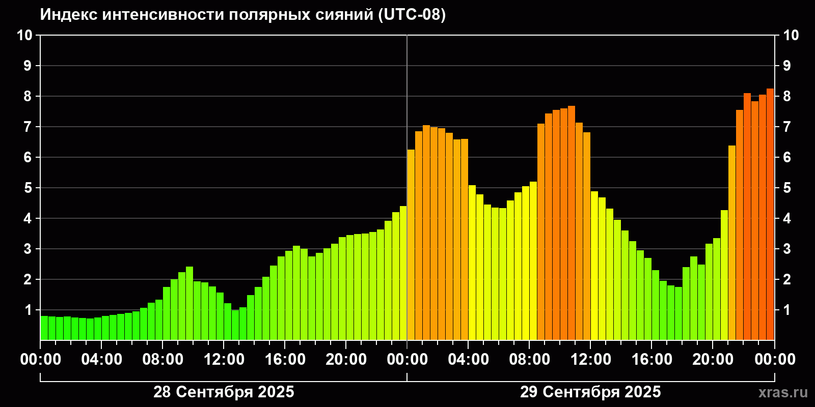 Изменения индекса интенсивности полярных сияний с 2025-09-28 по 2025-09-29 по местному времени