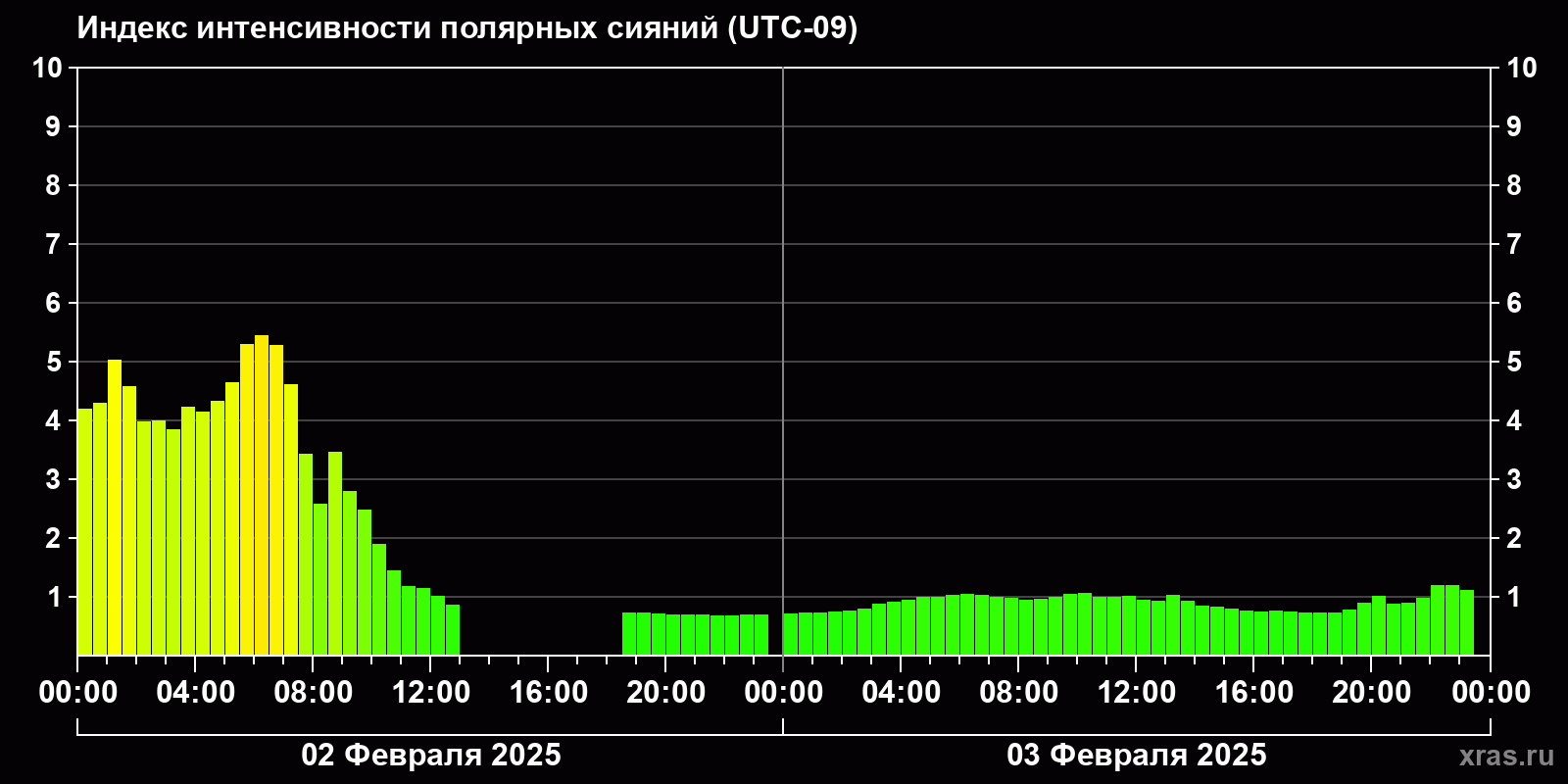 Изменения индекса интенсивности полярных сияний с 2025-02-02 по 2025-02-03 по местному времени