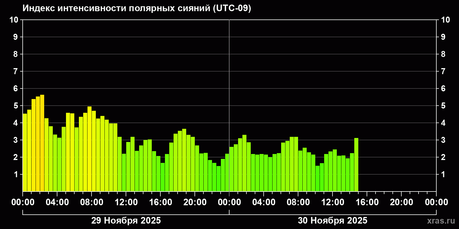 Изменения индекса интенсивности полярных сияний с 2025-11-29 по 2025-11-30 по местному времени