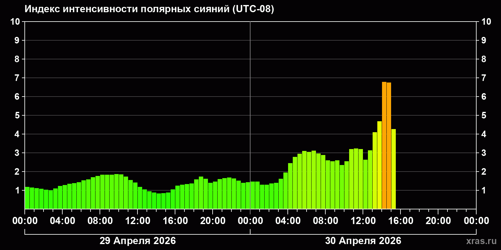 Изменения индекса интенсивности полярных сияний с 2026-04-29 по 2026-04-30 по местному времени