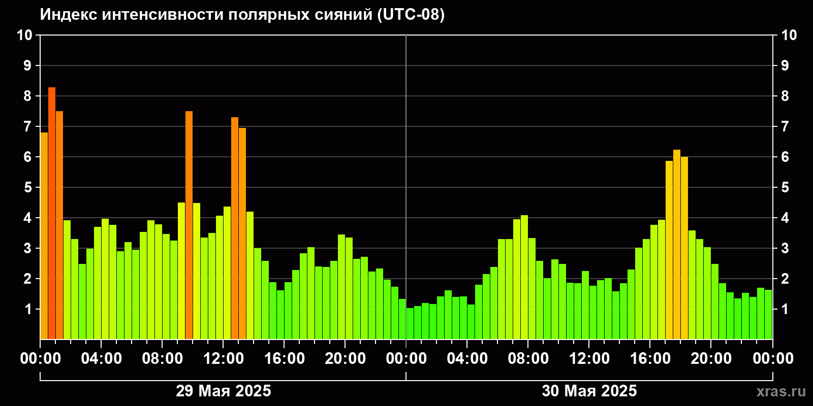 Изменения индекса интенсивности полярных сияний с 2025-05-29 по 2025-05-30 по местному времени