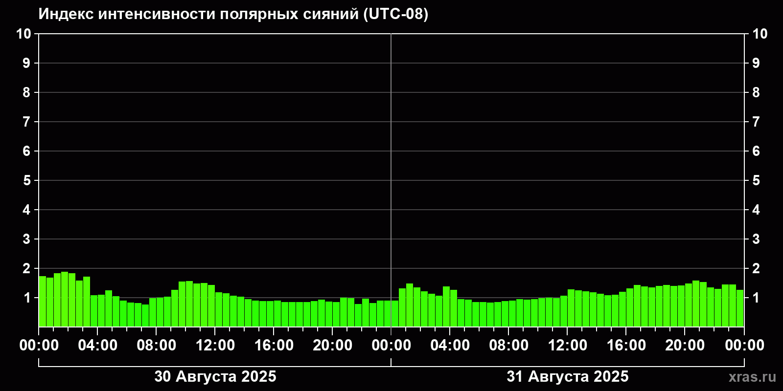 Изменения индекса интенсивности полярных сияний с 2025-08-30 по 2025-08-31 по местному времени