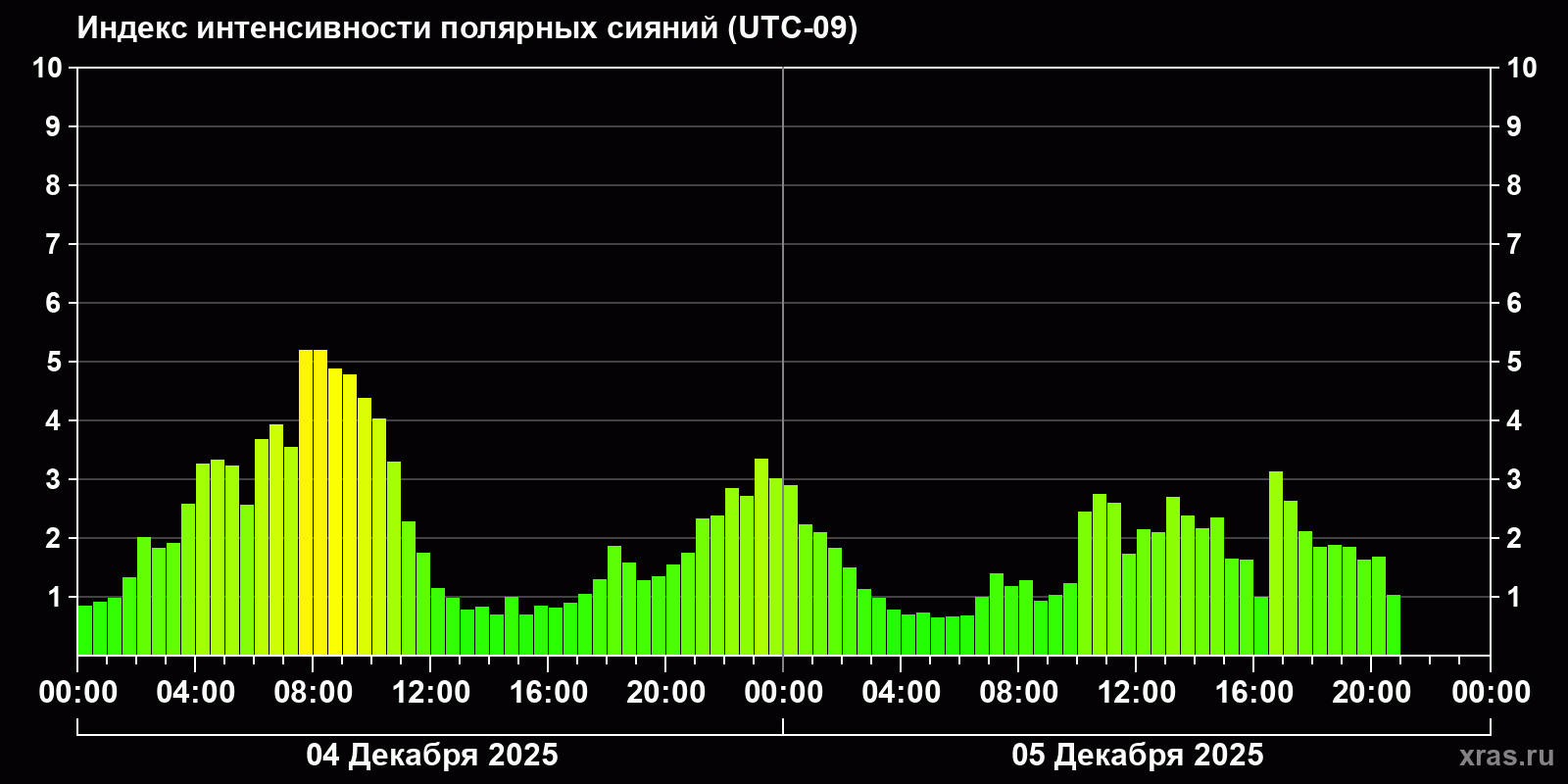 Изменения индекса интенсивности полярных сияний с 2025-12-04 по 2025-12-05 по местному времени