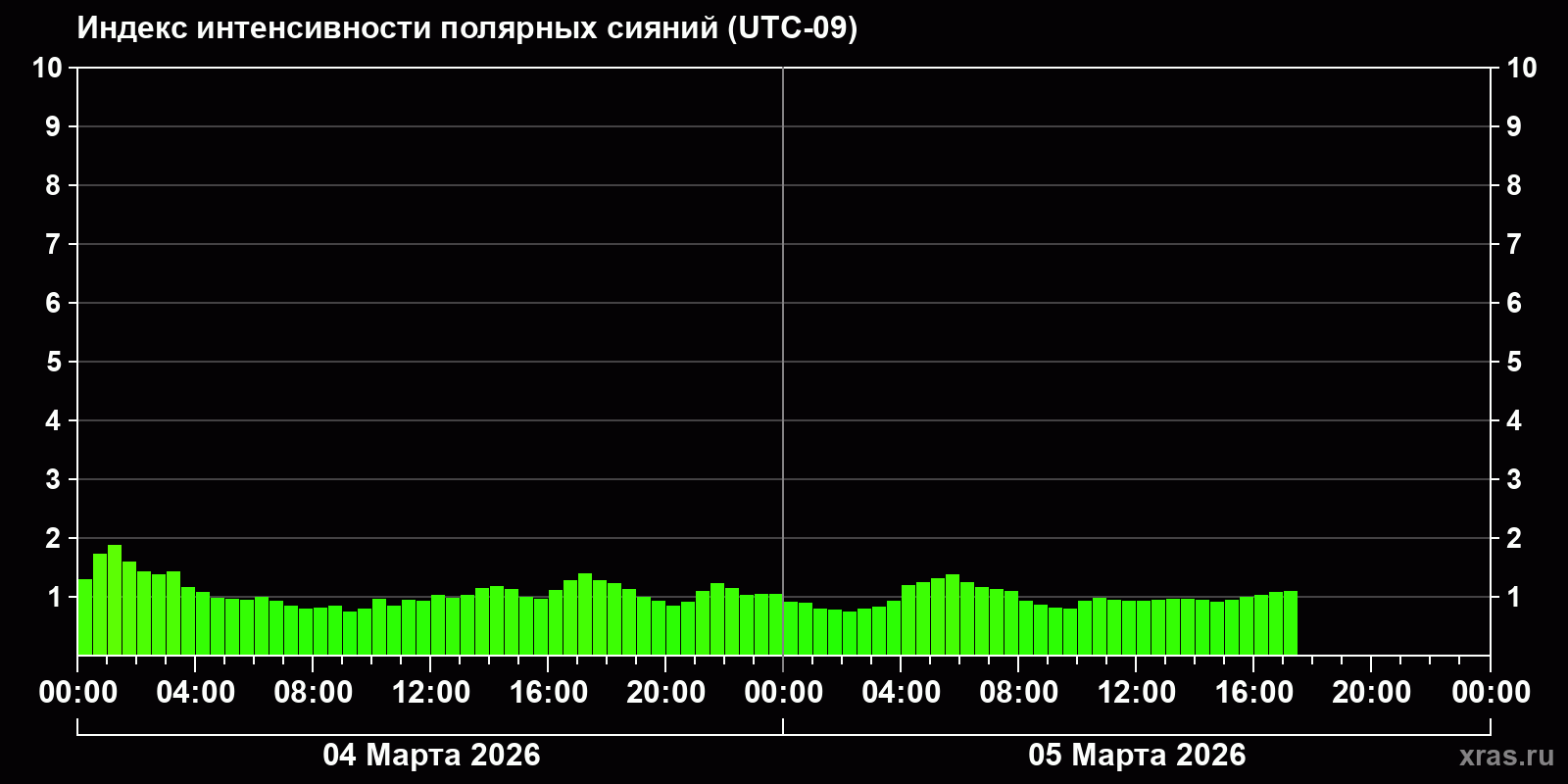 Изменения индекса интенсивности полярных сияний с 2026-03-04 по 2026-03-05 по местному времени